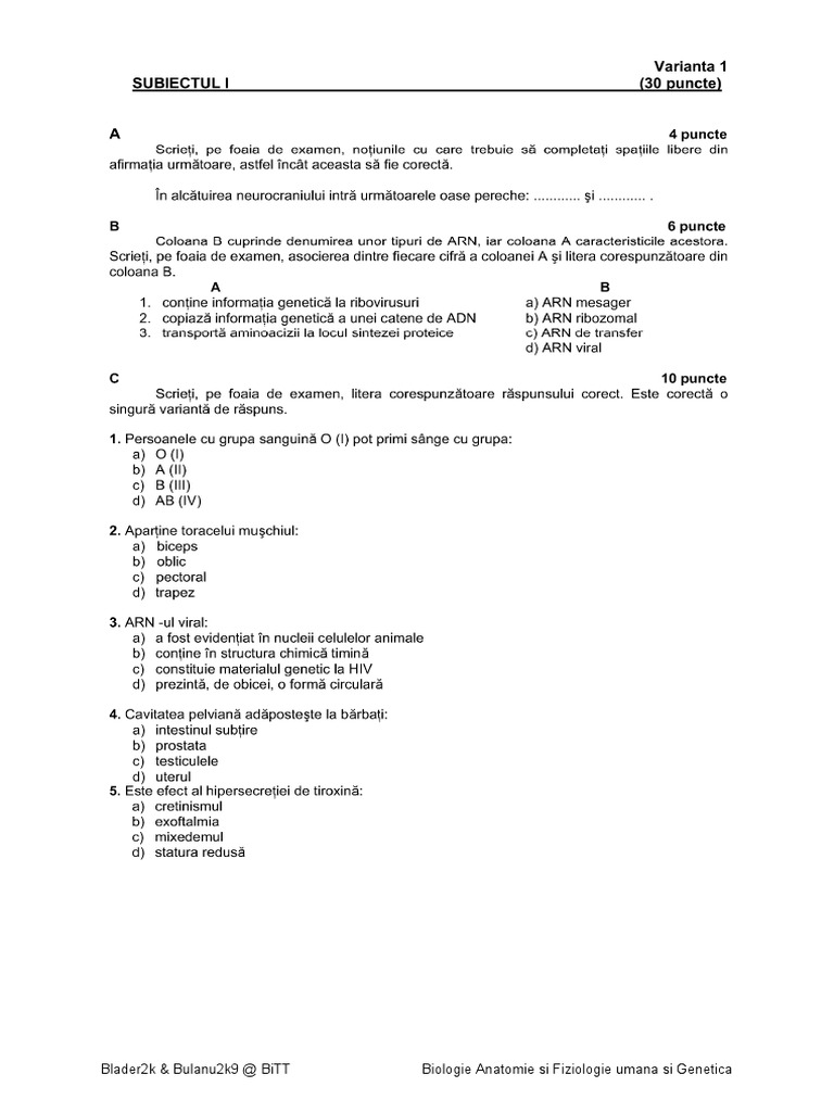 Dacă alegi „anatomie și fiziologie umană, genetică și ecologie, trebuie să știi că programa specifică acestei probe constă în materia studiată la liceu, biologie, în clasa a accesează variantele alese pentru sesiunile trecute ale bacului la anatomie (din 2016 și 2015), rezolvă singur cerințele, iar apoi. Bac variante 2 backtrackingfull description. Ortografie craiova2014 ultima olimpici 2010 subiecte bac biologie.