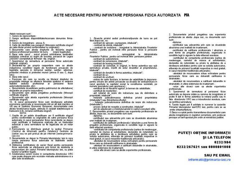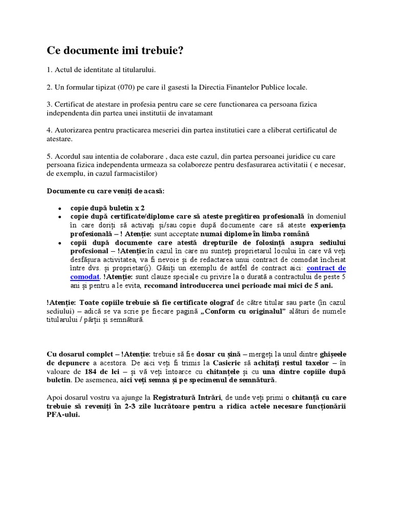 Salvaresalvați acte necesare infiintare pfa pentru mai târziu. Documentele necesare pentru inregistrare la registrul comerţului, inregistrare fiscala si autorizarea funcţionarii persoanelor fizice autorizate (pfa) sunt Acte necesare pentru autorizarea functionarii unui pfa.
