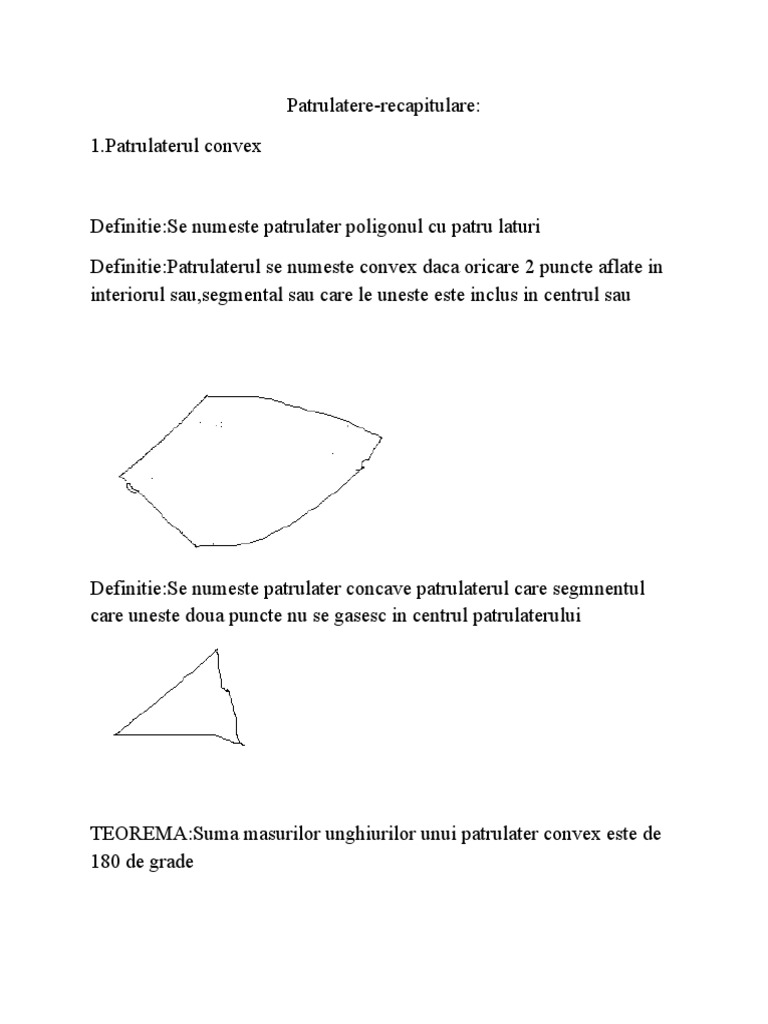 Un patrulater se numeste patrulater convex daca prelungind oricare dintre laturi toate celelalte sunt situate de aceeasi parte a ei. Un patrulater se numeste patrulater convex daca dreapta suport a fiecarei laturi nu separa celelalte varfuri ale patrulaterului, care nu se afla pe latura data. Constructie, elemente, suma masurilor unghiurilor si perimetrul unui patrulater convex: